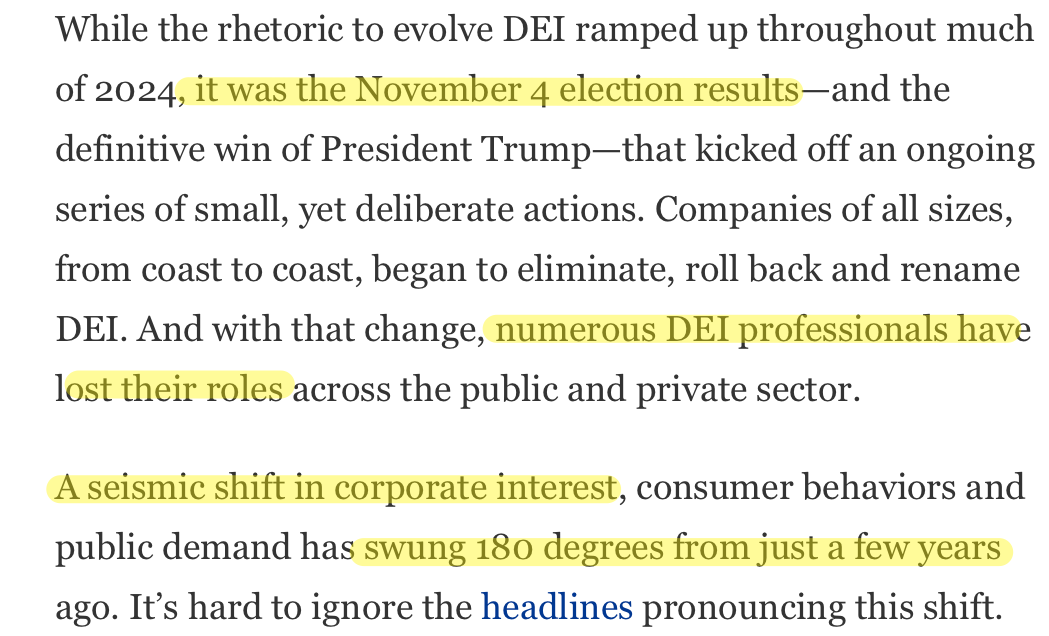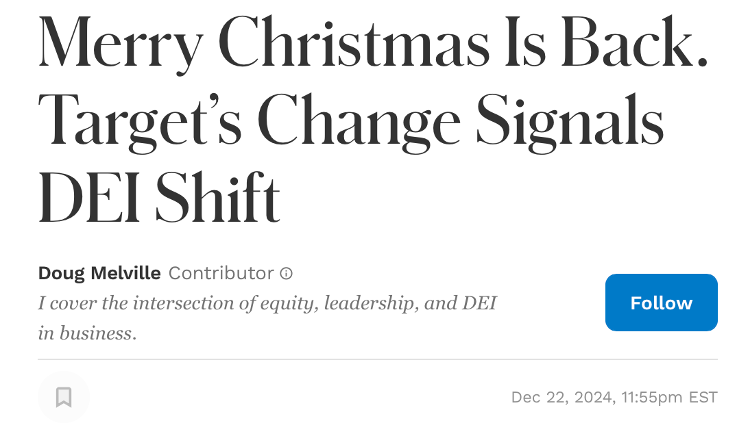 It is the Trump Christmas effect. Forbes extended its lukewarm observation about the return of “Merry Christmas” into a broader effect caused (or permitted) by the bare fact of Trump’s election: the death of DEI. It isn’t completely dead yet but it’s acting like a just-sprayed cockroach nest: