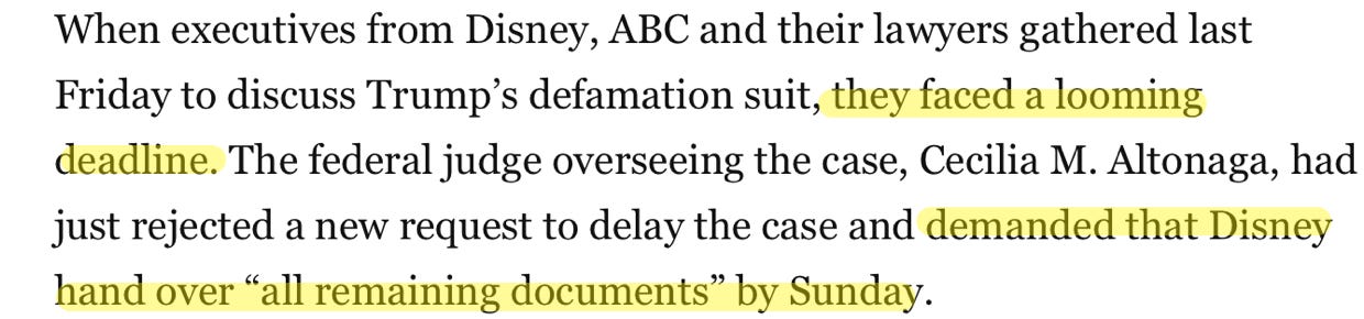🔥 Remember, winning these lawsuits isn’t even the most important goal. Now that Democrats and their mockingbird media allies have transformed nebulous “election interference” into a viable legal claim, discovery of the media is on the table. Discovery is a much more powerful threat than money. As the most recent example, the WaPo gave readers a little more information about why ABC settled its defamation case with Trump last week. Look: