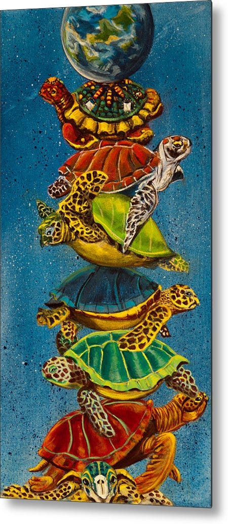 “You’re a very clever man, Mr. James, and that’s a very good question,” replied the little old lady, “but I have an answer to it. And it’s this: The first turtle stands on the back of a second, far larger, turtle, who stands directly under him.”