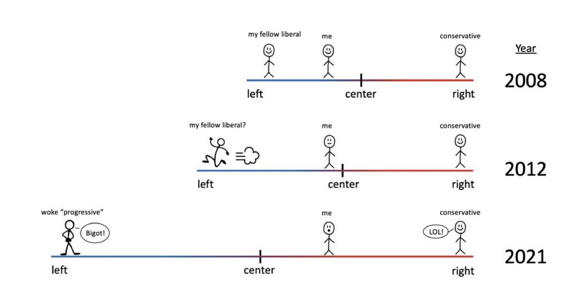 Maher is looking more conservative by the minute. But he hasn’t changed. Neither has Charlamagne. I’ll remind you of the brilliant cartoon illustration popularized by former democrat Elon Musk, showing how moderate liberals must be starting to view their place in the world: