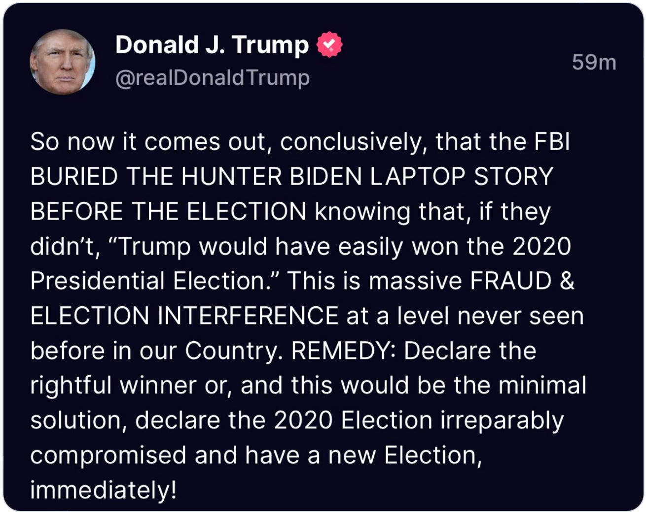 🔥 President Trump expertly trolled the media and the loony left yesterday by suggesting in a social media post that he be immediately declared president, or that the country promptly hold a new election. He was responding to news that Mark Zuckerberg told Rogan that just before the 2020 elections, the FBI ‘asked’ Facebook to bury any stories that looked like Russian propaganda, which Zuck told Rogan was the reason Facebook banned the Hunter Biden laptop story.