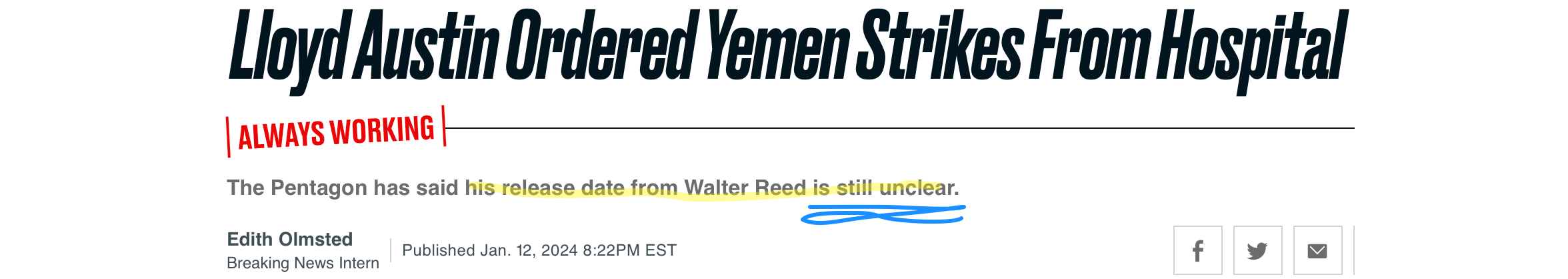 Is it just me, or was the “Always Working” banner a snarky giveaway? In any case, the Pentagon is caught in the crippling crux of two wildly incompatible claims. On the one hand, they claim the Defense Secretary is doing so well that he’s seamlessly working and issuing critical battle orders carefully expanding the highly-unstable Middle East war. On the other hand, they also claim Austin is simultaneously so sick that his doctors can’t even guess at when he can get out of the hospital.
