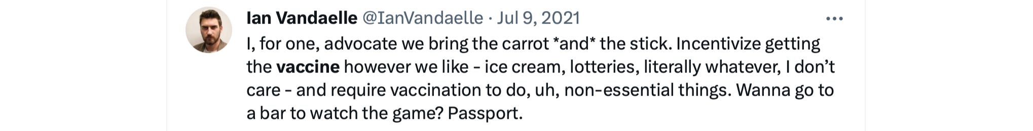During his life, Ian was a staunch, highly-motivated citizen volunteer for the covid vaccines. He was kind of a hard-liner actually, and frequently used his position to call for more vaccine mandates, strict passports, and harsh penalties for people who didn’t comply: