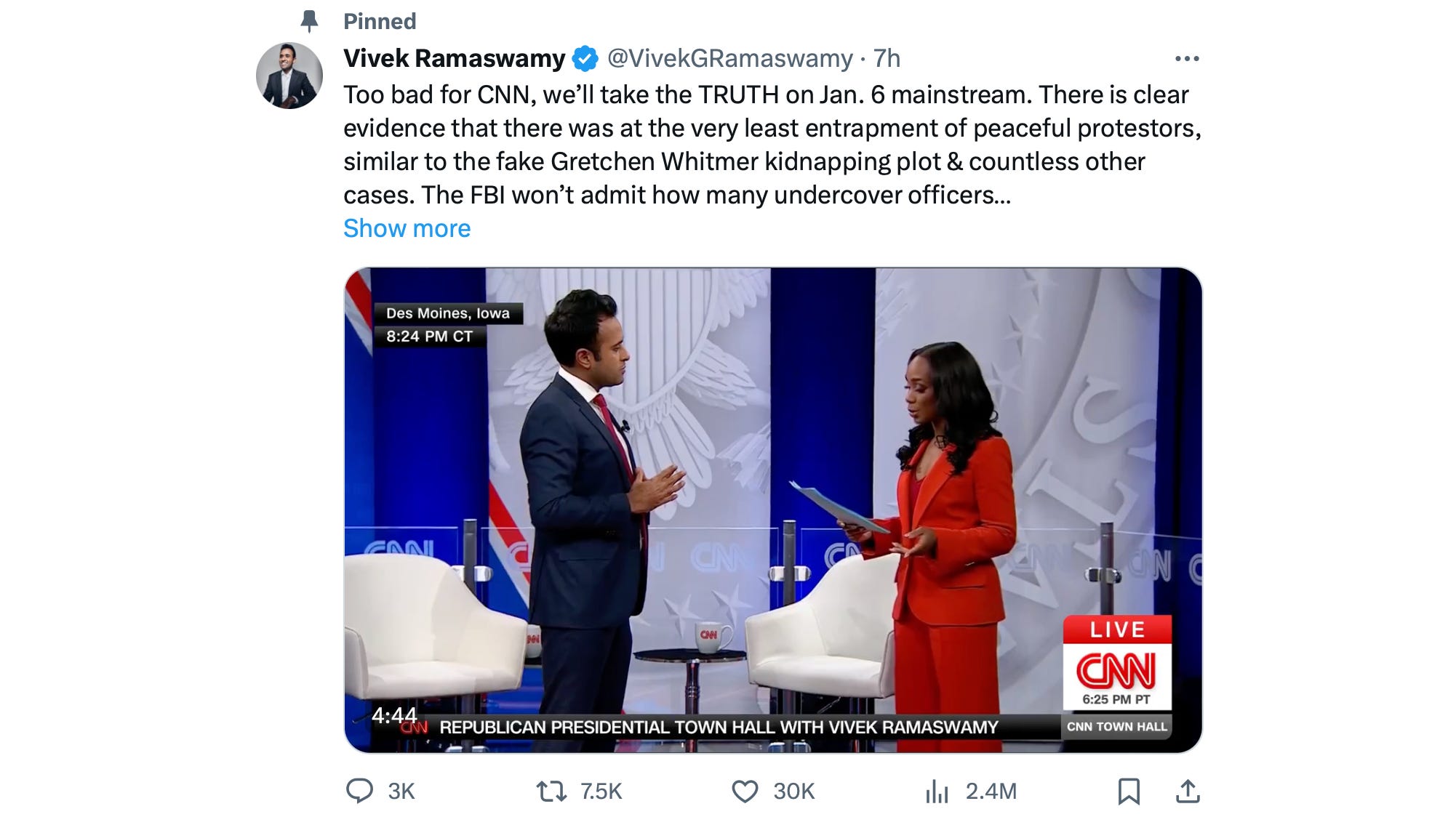 There’s a whole lot to love in Vivek’s answer, but I think my very favorite part was when Vivek said, “Abby, what I want CNN’s audience to know…” In other words, Vivek knew who he was really talking to: he wasn’t talking to Abby Phillip, but to the CNN audience, who are mainly people who think only white guys named Trump believe the government coordinated January 6th.