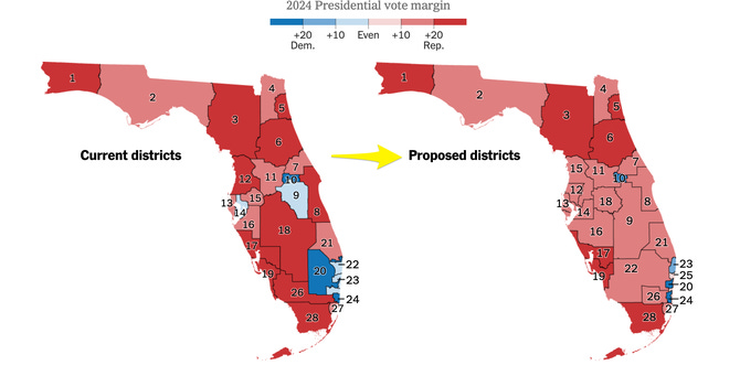 He wasn’t just randomly musing. In a legislative lightning round this week, right after SCOTUS issued its opinion, Florida’s House and Senate speed-passed a new redistricting bill that is now sitting on Governor DeSantis’s desk, and which would have been susceptible to Democrat legal challenges absent the new SCOTUS decision. Now it’s fine. Here’s the new map, which shifts +4 in the GOP’s direction: