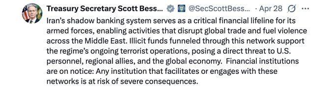 I’ve waited days for top corporate media to pick up this story, but they’ve gone all Mr. Magoo again. Late last week, Reuters thinly reported, “US sanctions wallets tied to Iran, freezing $344 million in cryptocurrency, Bessent says.” The story was so thin it was just one sentence. (Crypto News provided a little more detail.)
