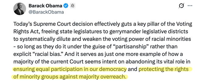 🗳️ Needless to say, Democrats are extremely upset by this race-neutral interpretation. They are practically hyperventilating. They claim the decision is “destroying democracy” and is “racist.” This is based on two misunderstandings. Both flawed concepts were exposed in Barack Obama’s awful take. He complained about (1) equal participation in “democracy,” (2) and the “rights of minority groups.”