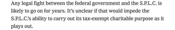 The professor answered her own question. (I guess it was rhetorical.) “My answer is, if we can, then they can,” she said. Of course, the Times didn’t quote any law professors explaining why it would make sense for Fidelity and Vanguard to defer donations to the SPLC. But it did finally get around to the gist, or nub, which was that this development is likely going to sting: