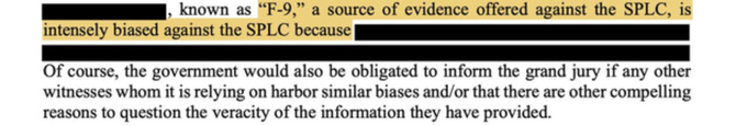 🔥 But that was just the first domino to fall. Remember the old saying? It goes something like: lie down with dogs, get up with criminal indictments. The second story did not appear in any corporate media report I could find, but appeared in the SPLC’s own court filings. Specifically, the SPLC admitted that one of its “paid informants” has flipped and is now cooperating with the DOJ against it. Their current story is that “informant F-9” is intensely biased against the SPLC: