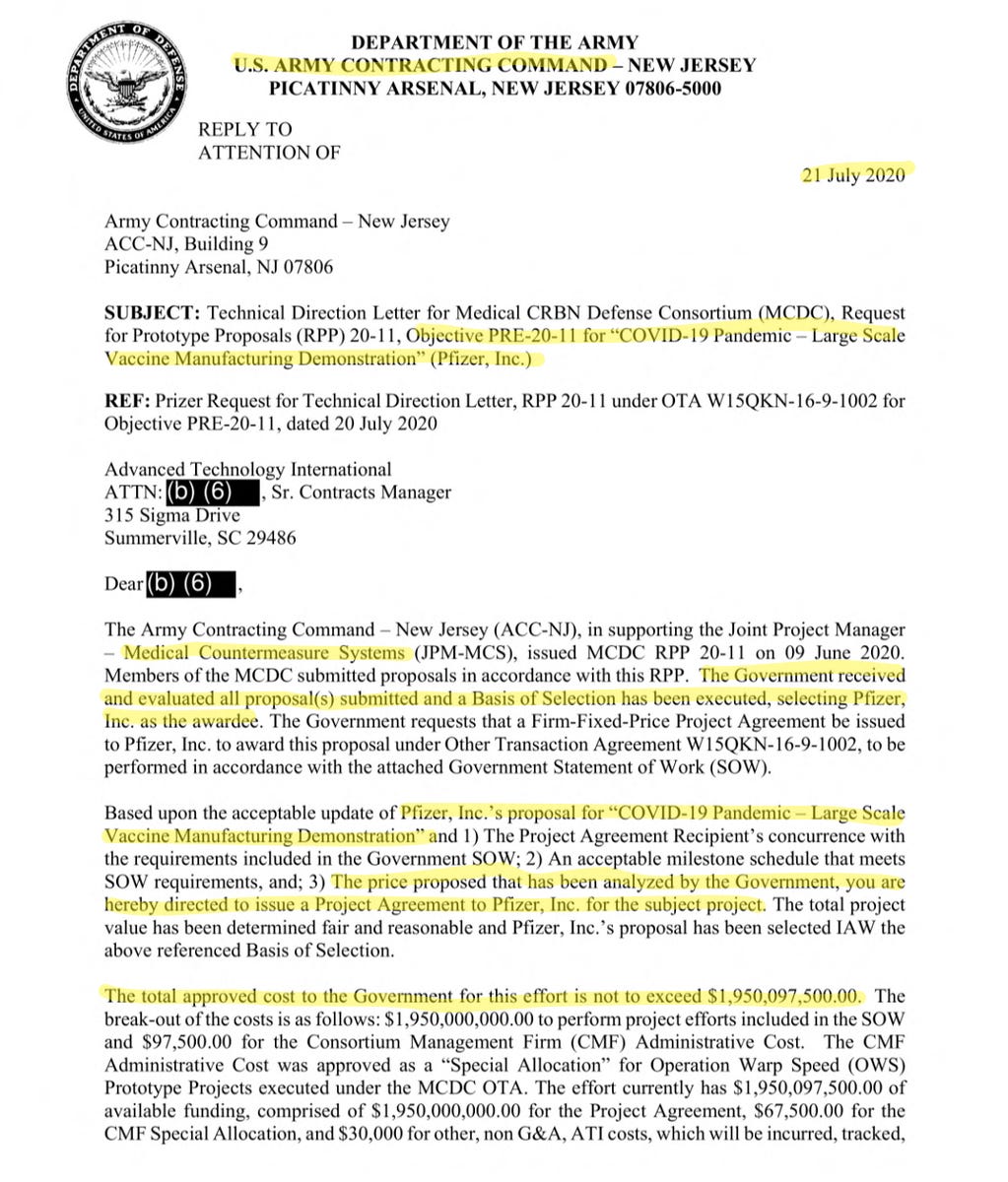 Here is one of the FOIA documents. It’s a $2 BILLION DOLLAR CONTRACT award to Pfizer from U.S. military procurement in July of 2020.