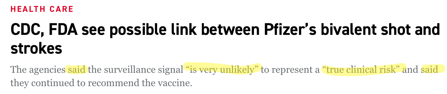 Politico ran the story with this headline: “CDC, FDA See Possible Link Between Pfizer’s Bivalent Shot and Strokes.” And for good measure, they added this sub-headline: “The agencies said the surveillance signal ‘is very unlikely’ to represent a ‘true clinical risk’ and said they continued to recommend the vaccine.”