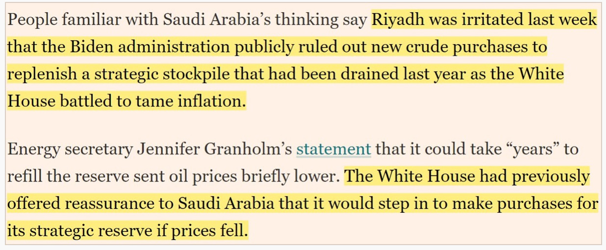 Although price recently fell below $80 a barrel, Joe mumbled we WON’T refill the depleted Strategic Reserve like he’d promised, for some reason. So OPEC naturally responded. What did he THINK they were going to do?