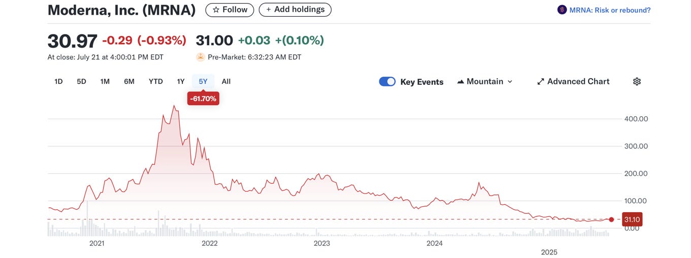 Even better, those kinds of comments from the FDA chief can’t be good for business. Once the darling of biomedical startups, Moderna is now garnering headlines like this: “Here's Why Moderna (MRNA) Fell More Than Broader Market.” (Media Malfeasance Reminder: when the headline promises a reason, it never delivers anything true.) The mRNA stock is now scraping along a dead coral reef at an all-time low.