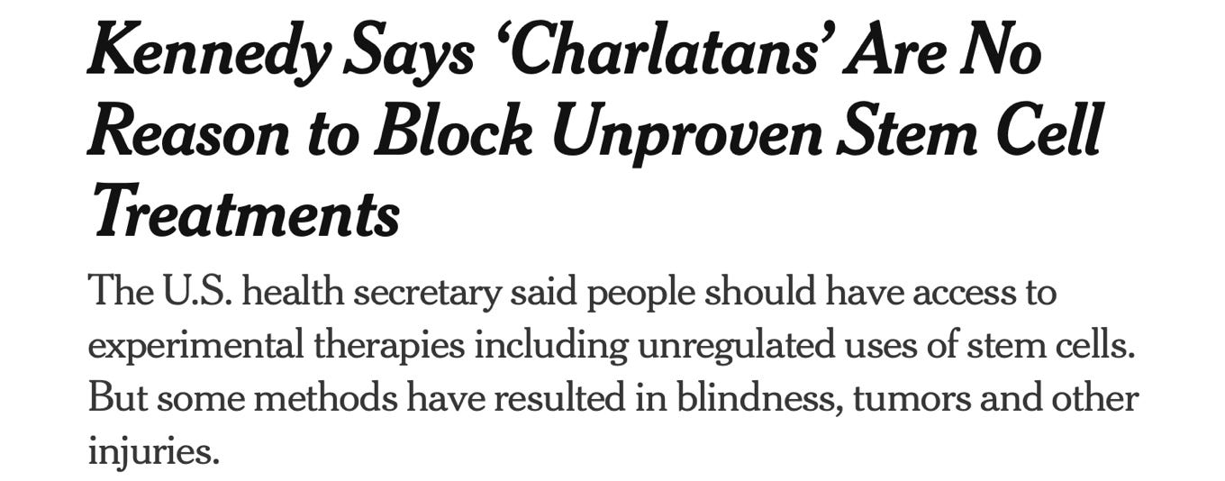 🔬 A few weeks ago, HHS Secretary Robert F. Kennedy Jr. made headlines with a surprise stop in Aruba, where he checked in to a well-appointed stem cell clinic known for treating affluent Americans. It sparked speculation that a federal rethink of stem cell policy may be in the works. He also made the New York Times, which ran a typically sneering, skeptical headline: