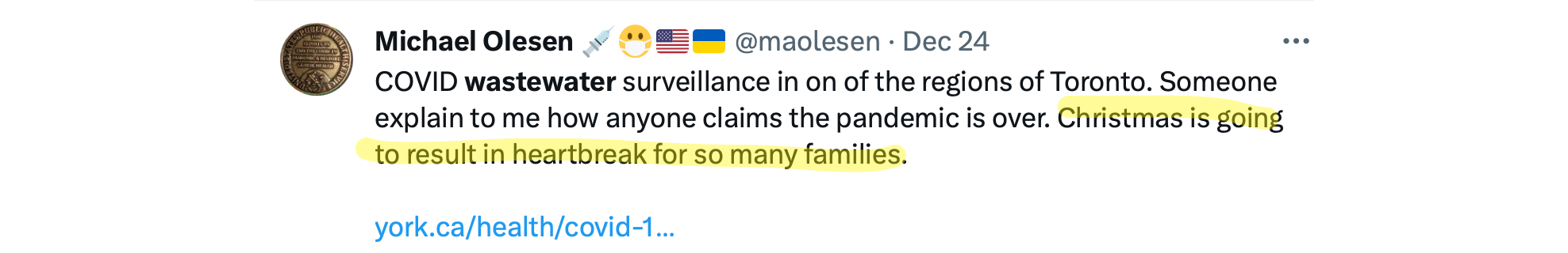 Before you ask, the “brung back mask mandate” was not new; it’s a standing Mass General policy triggered by a very small percentage (2.85%) of emergency visits from any respiratory virus. Mass Gen just reached 2.85% for the first time this fall, and — following its existing policy — said it will require workers to mask starting January 2nd. Now check out this next sentence the Globe slipped into its story way down the page: “Last year, local hospitals experienced respiratory infection levels as high as 7.3% during what many health officials called the tripledemic.”
