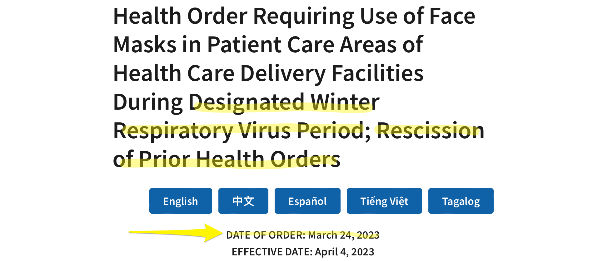 First of all, the headline overpromised. No agency with enforcement ability has newly mandated masks. And there weren’t even any mandates mentioned outside of hospitals and hospital workers. Newsweek scraped up four Bay-area counties that have ordered healthcare workers to wear masks in healthcare facilities. And check out this sly bit of media misinformation — when I looked up the article’s referenced masking order on the Santa Clara County website, I discovered it was a mandate from March 2023 that rescinded all other mask mandates and created a perpetual “winter virus period” mask mandate and only for healthcare: