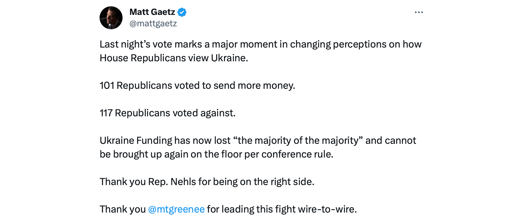 🚀 Speaking of Republican budgets, on Thursday night House Republicans voted 117-101 against sending another $300 million to help secure Ukraine’s borders. Per conference rules, Ukraine funding is now dead and cannot be voted on anymore this budget cycle.