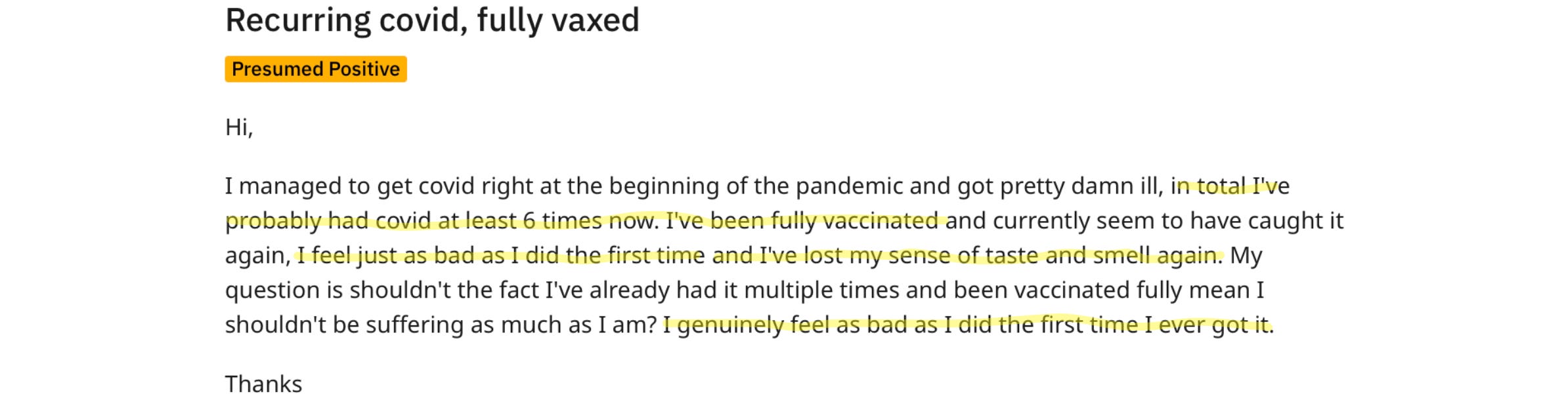 💉 A very unfortunate recent Reddit post made the rounds yesterday. The post appeared on the bulletin board r/Covid19Positive, and the poster complained she’d had all the safe and effective vaccines, but still got covid six times, and has now lost her sense of taste and smell again.