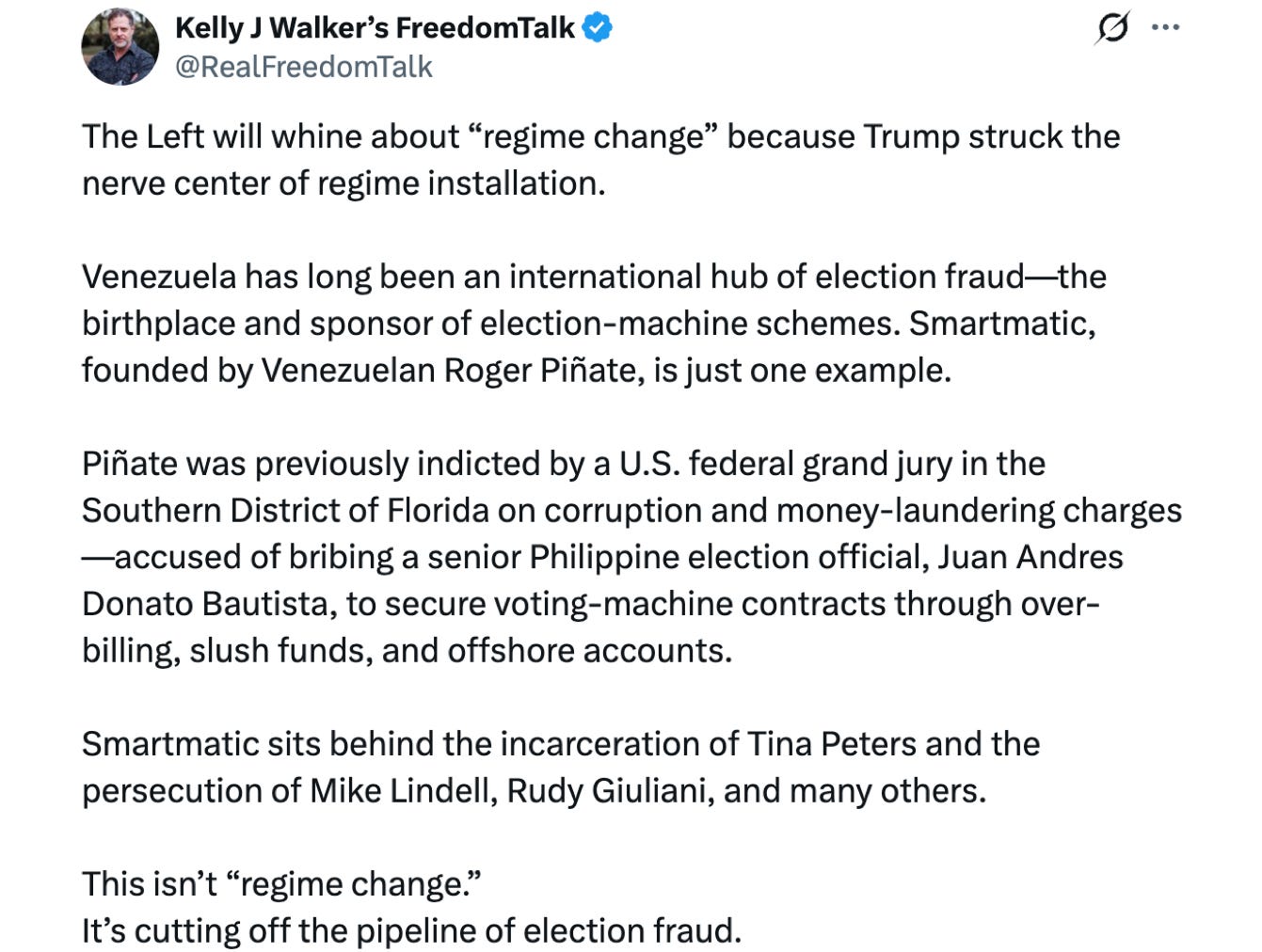 🚀 No. They are wrong. Dead wrong. Wrong in many different ways. First, the lightning strike to grab a known nefarious actor —an indicted criminal with a $50M U.S. bounty on his head, nobody denies that— is neither “nation building” nor “a new forever war.” We have not replaced Maduro with any “transitional government.” We haven’t occupied, landed in, or invaded Venezuela, like we did in Iraq or Afghanistan. So comparisons to those conflicts are just wrong.