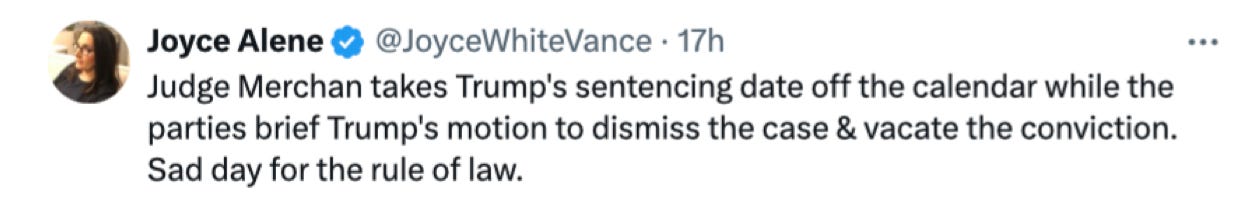 MSNBC’s far-left legal commenter Joyce Alene (1 million followers) wailed that yesterday was a very sad day for her idea of the rule of law:
