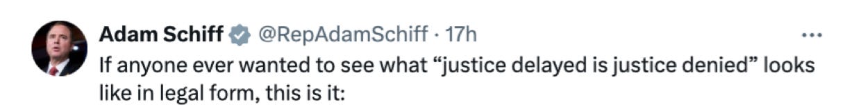 For example, ranting Representative Adam Schiff (D-Ca.), called it “justice denied”: