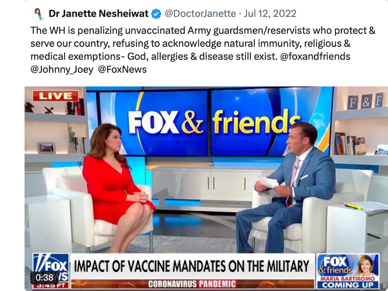 On the plus side, despite pushing jabs, during the pandemic Janette was consistently anti-mandate, pro-religious-exemption, and pro-military. In early 2020, before it went sideways, she even endorsed Trump’s recommendation for using hydroxychloroquine to treat covid infection. We have no idea whether Janette has "evolved" any of her pro-jab positions after seeing how badly things played out. She does seem sane, so there’s a chance.
