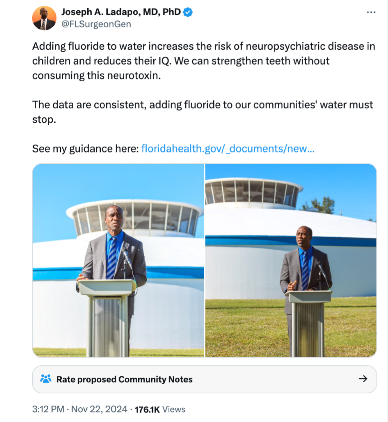 The Tampa Bay Times ran a terrific story yesterday headlined, “Florida Surgeon General opposes fluoride in water as he is eyed for Trump admin.” And so, it begins! Not waiting to see whether Robert Kennedy, Jr. is confirmed for Secretary of HHS, standout Florida Surgeon General Joe Ladapo shattered records and made history yesterday, by establishing Florida as the first state in the Union to recommend against public water fluoridation:
