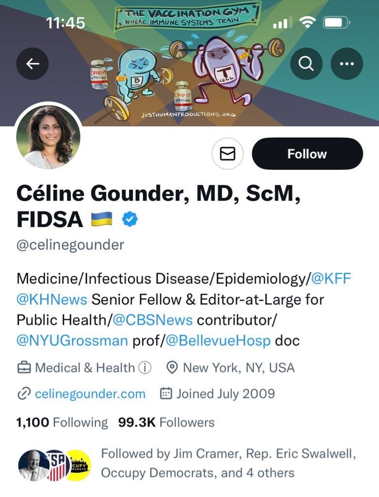 That’s not all. Grant’s broad-minded widow is also a member of Joe Biden’s vaccine-happy Covid-19 Advisory Board. Here’s her twitter bio: