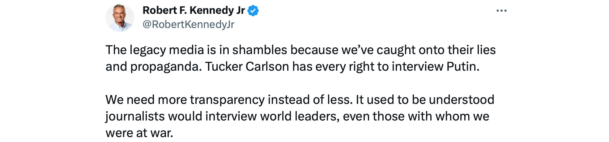 But, even if it is fair to make the Tucker-Fonda comparison, then I guess democrats have nothing to complain about, since they found Fonda’s trip entertaining and elucidating. Even among democrats though, opinions vary. At least one democrat, dare I say liberal, Robert Kennedy, Jr., not only supports Tucker’s right as a journalist to report from wherever he feels it necessary, but went so far as to suggest the extra transparency of hearing directly from Putin instead of just from invisible military propagandists might even be a good thing.