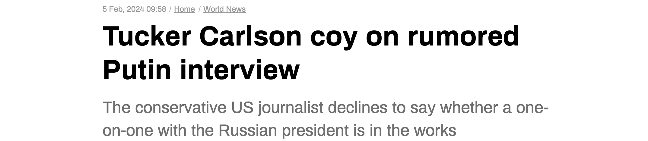 🔥 Following cascades of weekend rumors — and appalling liberal meltdowns — over Tucker’s mysterious trip, previously only rumored but now confirmed to be to Moscow, where the hated enemy of Ukraine dwells and takes up space, Russia Today ran this beguiling headline last evening: