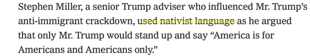 Nativist language? What is that? Is it like Cherokee? Nobody but woke academics understand that kind of gobbledygook. It’s a dog whistle for globalists, who think Germany should be for Germans and Mexico should be for Mexicans, but America should be for everybody.
