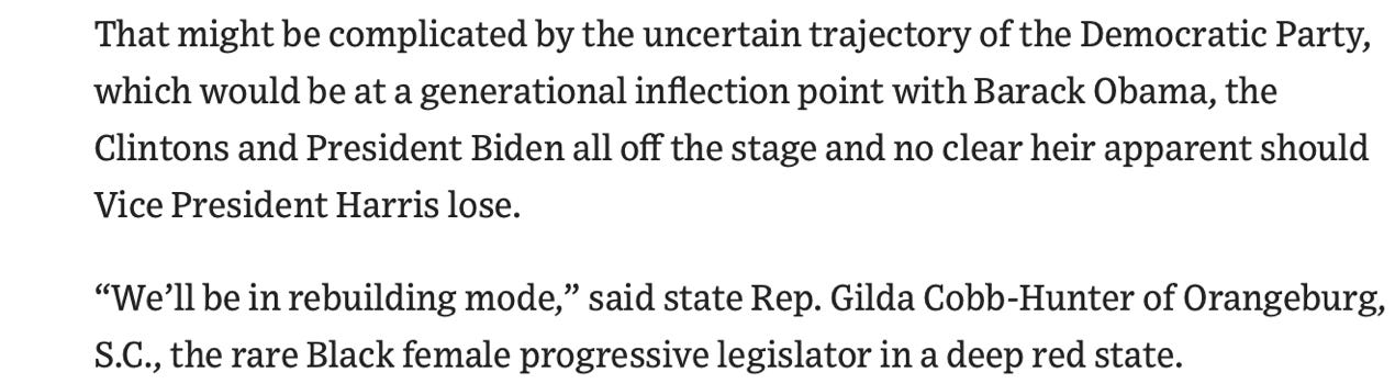 The Dems new problem is even bigger than trying to psychologically prepare themselves for the heretofore unimaginable defeat of the fakest candidate in American history. No, the WSJ observed a much worse problem: how shallow and uncertain the Democrats’ bench is: