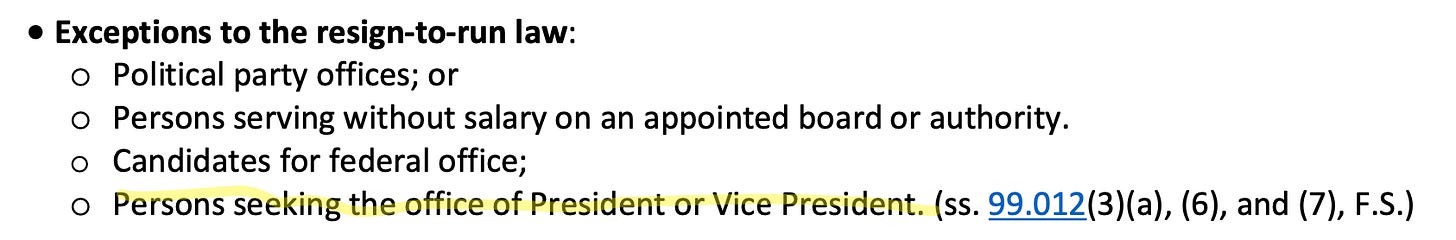 I’m not the only one suspecting presidential campaigns are excepted from Resign-To-Run, as you can see from this excerpt from the Division of Election’s website — which was posted in 2018, long before DeSantis had a whisper of a clue of running for President: