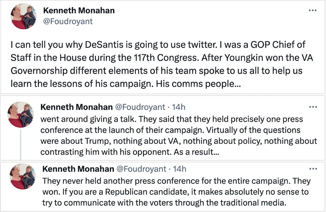 A conservative candidate’s advantages in dis-intermediating corporate media were neatly described in this thread about Glenn Youngkin’s successful gubernatorial campaign, written by a former insider: