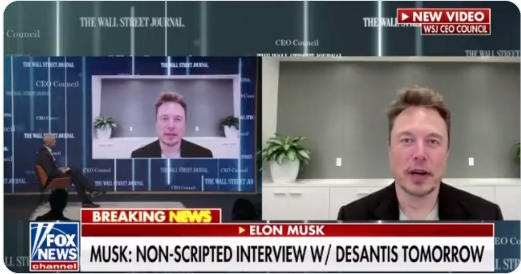 🔥 In a presidential first, Florida Governor Ron DeSantis will announce his official candidacy today at 6pm EST — on social media, not on “the news,” in a Twitter space with Elon Musk. A “Twitter space” is a live event, an audio version of a zoom session, which is controlled by one or more moderators who do all the talking, and is attended by any number of listeners.