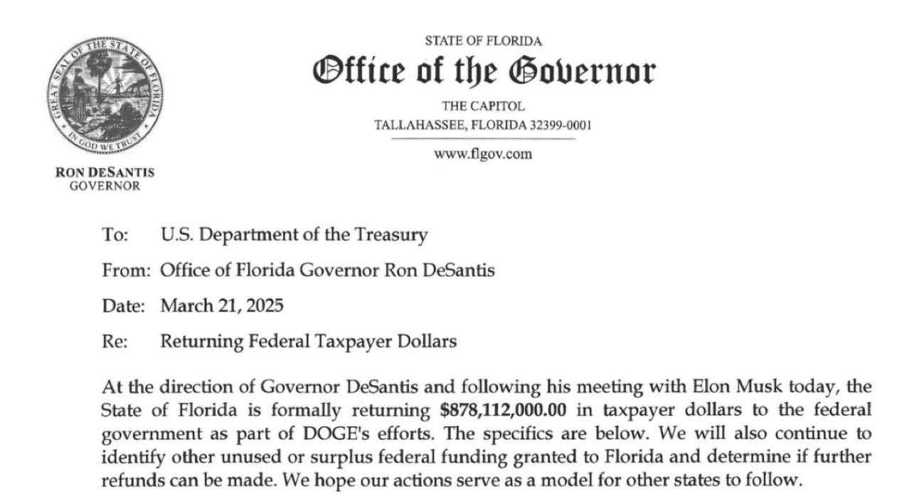 As far as I can tell, only Fox carried the astonishing story yesterday, headlined “DeSantis says Florida returned $878M in taxpayer funds to federal government after meeting with Musk, DOGE.”