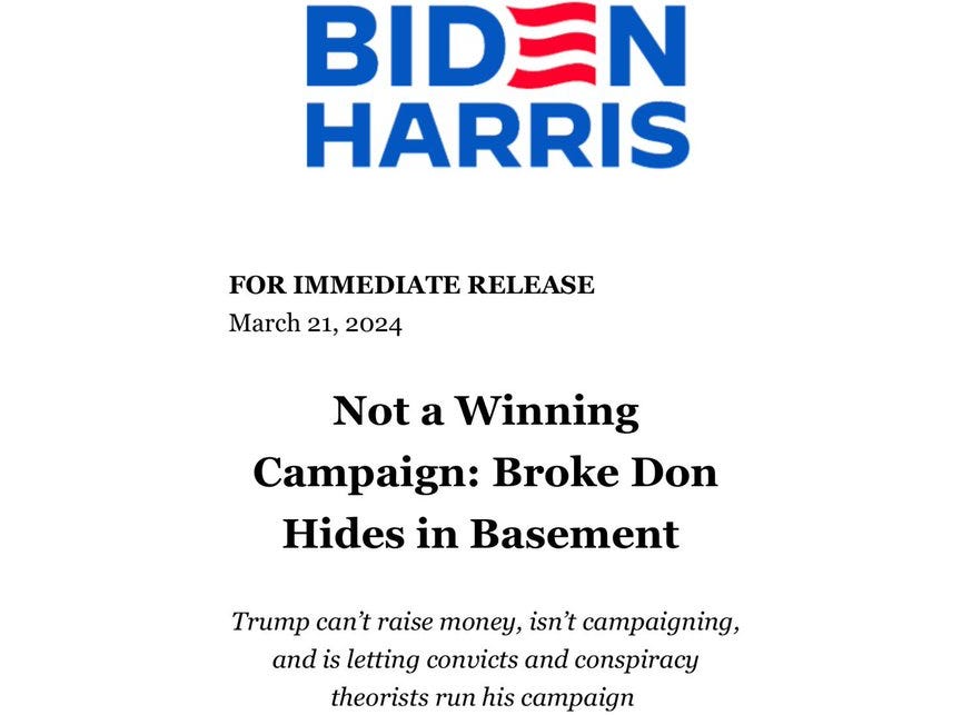 Three days ago, the Biden Campaign released an unseemly series of messages and ads prematurely celebrating President Trump’s inability to pay for his appeal bond. The new campaign tried to stick Trump with a dumb new nickname, “Broke Don”: