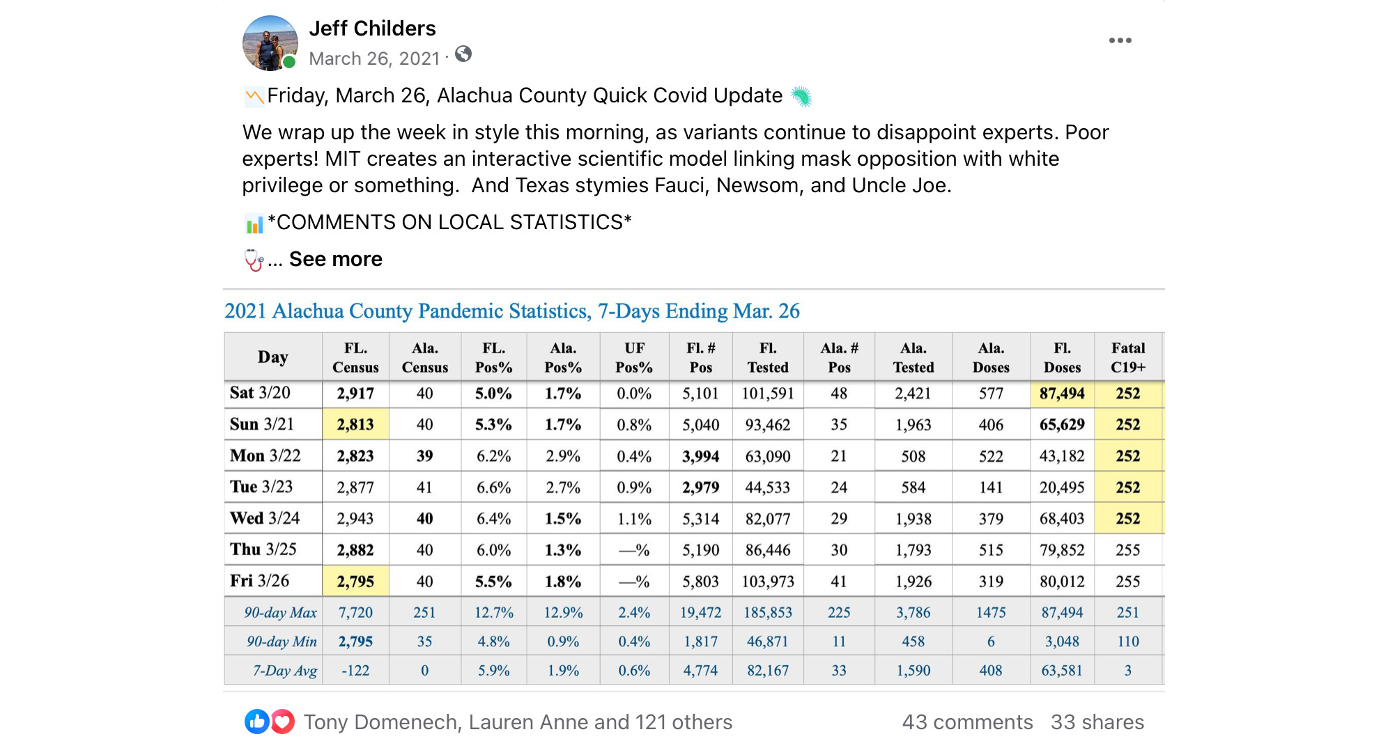 Over the first few months, my Facebook blog, not yet called Coffee & Covid, evolved a lot as I added more and more daily covid data, and I started including my own comments on the covid data and the day’s optimistic pandemic news. For instance, here’s the March 26, 2021 post, one year in, which shows my then-classic covid spreadsheet:
