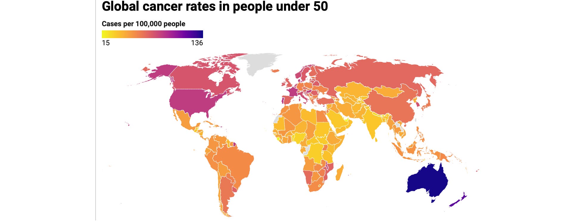 Maybe the Mail’s handy infographic map could give us a clue. It shows western countries plus Russia and China with the highest rates of under-50 cancer: