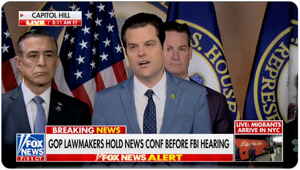 I like how Gaetz is framing it as the FBI being victimized by political capture. That’s an elegant way to put it, and accounts for the many good FBI agents struggling to stay afloat in their politically-weaponized agency.