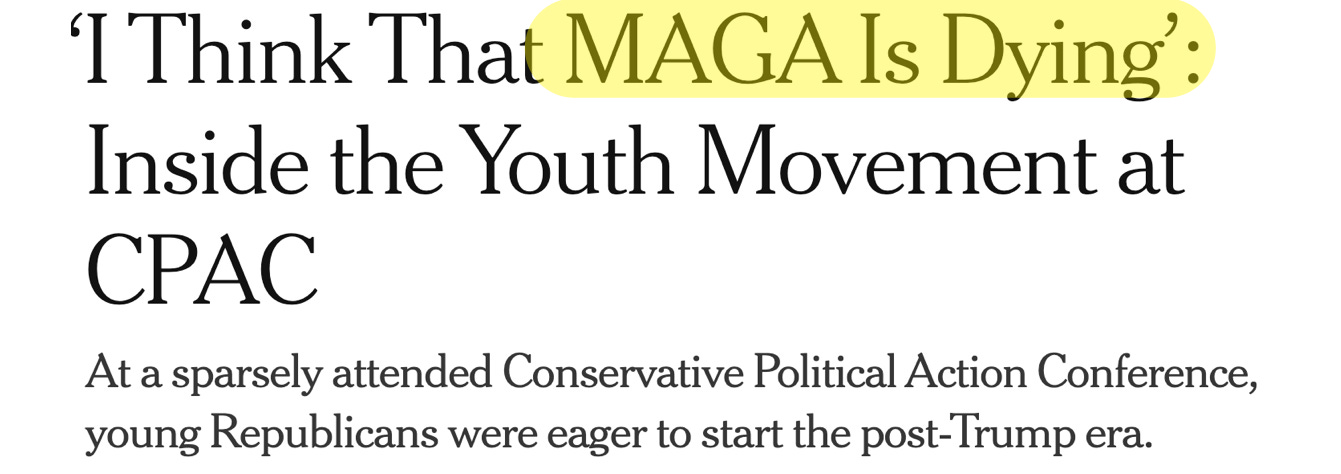 Good morning, C&C, it’s Tuesday! March is ending, capping off 2026’s first fiscal quarter and making accountants start sweating and ordering extra tax software. Don’t worry guys, just use AI like everyone else. Today’s roundup exposes yesterday’s sneaky corporate media push to gin up more MAGA fractures: corporate media’s triple-fracture fantasy exposed; why asking MAHA voters if Trump has “done enough” proves nothing except that they want more; the Times’ desperate attempt to manufacture a conservative “scholar split” (spoiler: they couldn’t find any scholars who actually agreed with them); CPAC’s rumpled-suit crime wave; the James Fishback phenomenon and trad-media mystery; and the REAL fractures happening in the Democratic Party that nobody’s covering.