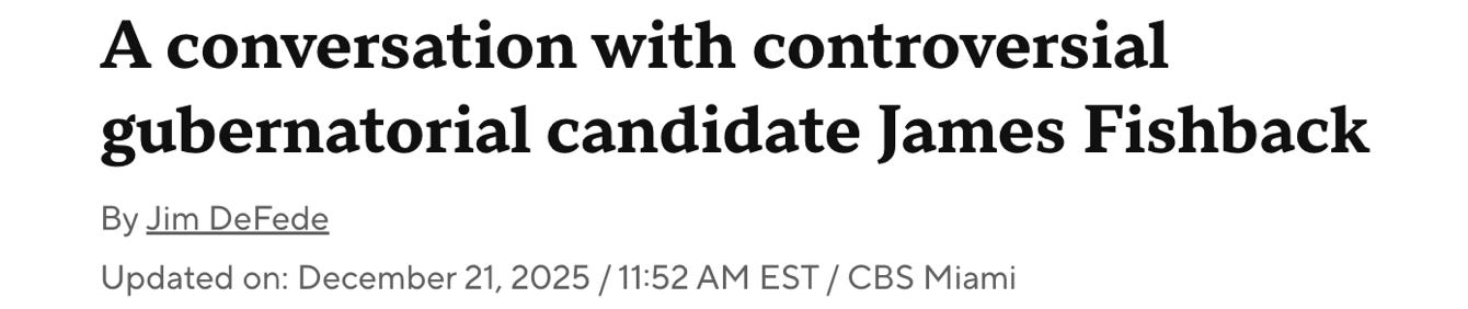 Let me be clear. I’m not punching at Fishback. I don’t know him. He has zero chance of winning the Florida gubernatorial nomination. He’s a right-wing horsefly who seems to relish the role. From what I can tell, I probably agree with him —at least directionally— on 80-90% of the issues. While we disagree on style and rhetoric, and certainly on infighting techniques, I’m not trying to cancel him.