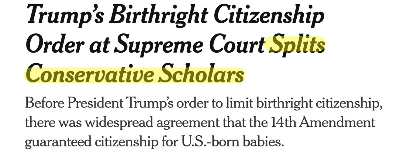 Next, NYU’s Richard Epstein filed a scholarly brief in the case supporting Trump’s position. Professor Wurman had even told the Times itself that “this question is not open-and-shut, that conventional wisdom may not be correct, and that the Trump EO has more going for it than people realize.” Bloomberg Law —one Google search away— ran a piece headlined “Trump Birthright Citizenship View Rests on Originalism, Not Vibes.”