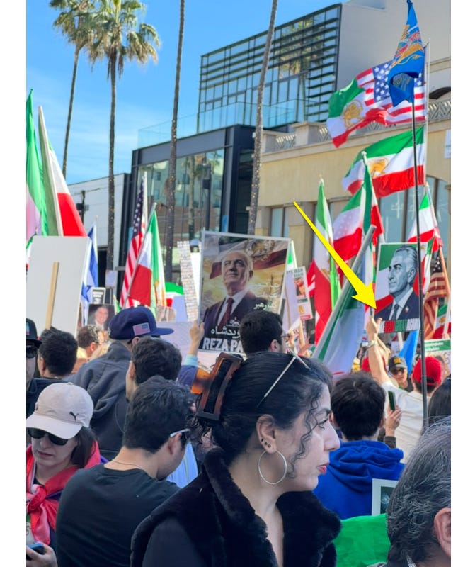 In a non-coincidence, when Michelle and I were in Santa Monica last weekend and taking a Sunday afternoon stroll, we stumbled into a massive downtown demonstration: thousands of Iranian-Americans supporting Crown Prince Reza Pahlavi and demanding regime change in Iran. Here’s a picture that I personally took on my iPhone; the sign is a little hard to read, but it says “Make Iran Great Again.”