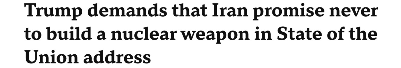 Four days ago, on February 24th, Trump warned them again. Just say it. He reinforced the deadline from the House chamber during his State of the Union address: “We are in negotiations with them. They want to make a deal, but we haven’t heard those secret words: ‘We will never have a nuclear weapon.’” CBS headline, February 24th: