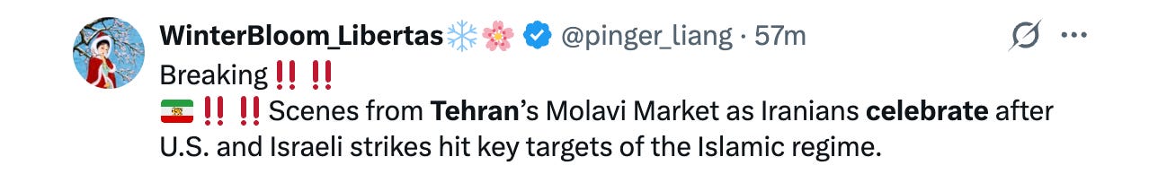 Within hours of the strikes, videos emerged from Tehran showing jubilant crowds on Jomhouri Street dancing, playing music, cheering the explosions overhead, and shouting slogans of freedom. Some were chanting “I love Trump!” — in a country where saying that out loud last week could get your tongue cut out, or could get you shot in the street by the IRGC. (But let’s not interfere with their local customs.)