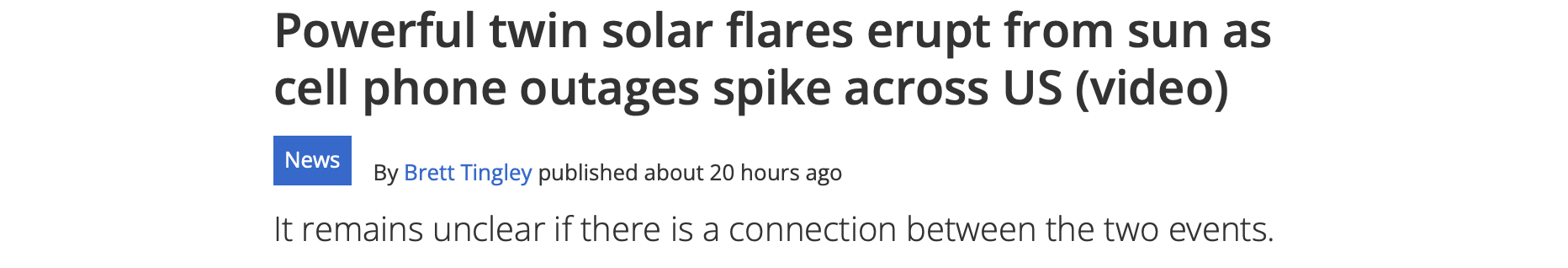 So out of the gate, there was a tantalizing correlation between the giant solar flares and the timing of the cell network’s outages. It wasn’t just Chron. Early yesterday, Space.com also asked the obvious question in an article on its website: