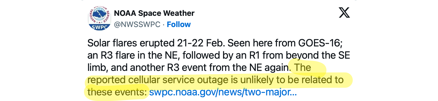But shortly thereafter, the National Oceanic and Atmospheric Association’s Space Weather team pooh-poo’d the notion that solar flares could possibly have caused ten hours of problems with cell services. Well, NOAA said it was “unlikely.” There was no evidence. I initially accepted that, thinking it was more likely a massive cyber-attack: