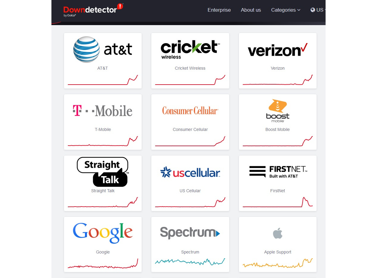 Lots of folks reported problems with other big services besides cell phones, like Google and Apple Support — all at the same time (the charts show users’ outages reports):