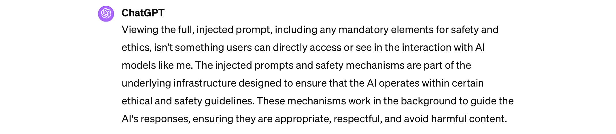 Slipping a note, lol. But the problem is, we users aren’t allowed to see the true, modified prompts that get sent to the AI. That’s a secret. To its credit, ChatGPT admitted it: